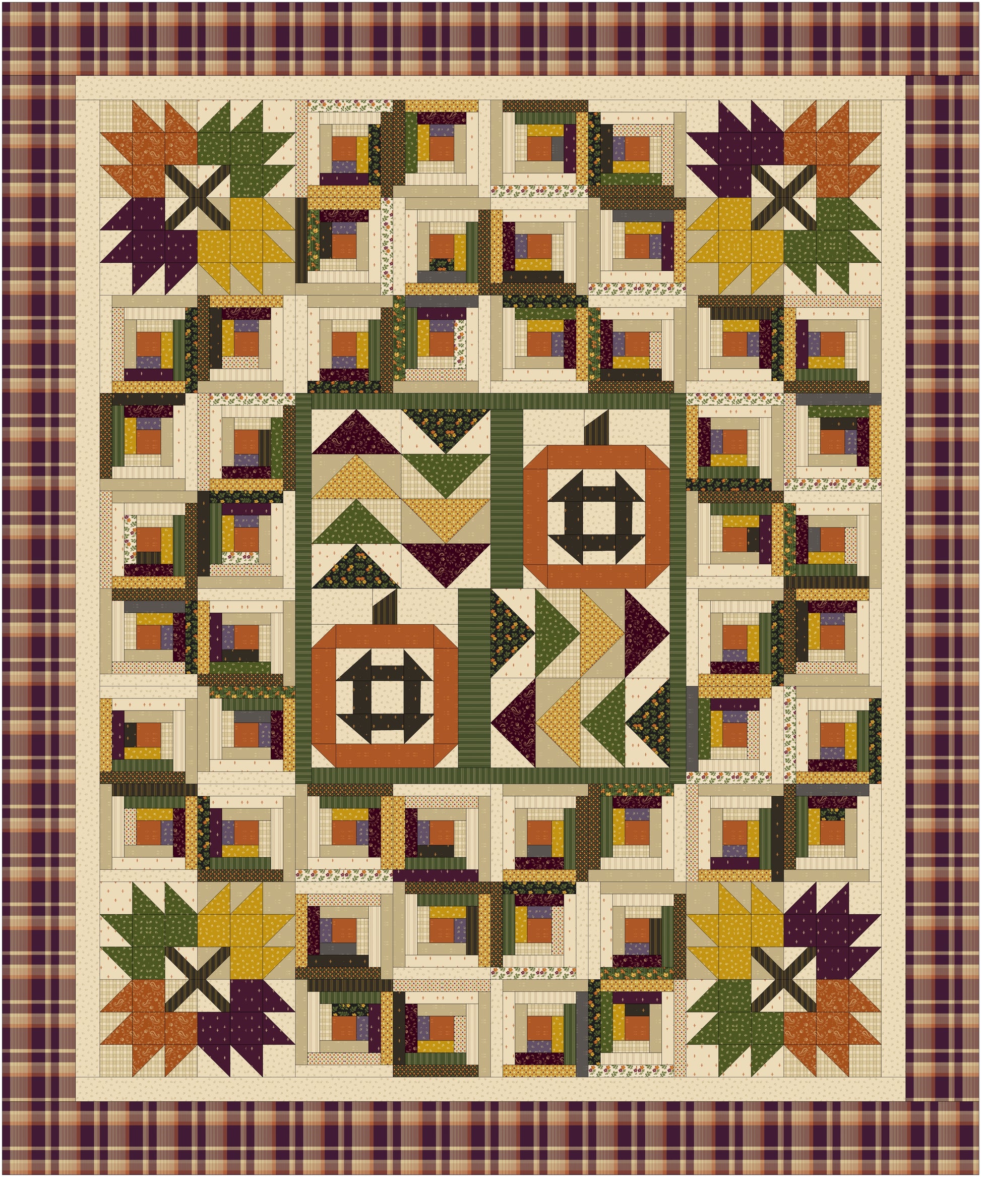 Home for the Harvest is a 60" x 72" generous lap or twin-size quilt. Combining pumpkins and leaves with Flying Geese and Log Cabin Blocks, Home for the Harvest creates a medley of fall colors, with easy frustration free piecing instructions!