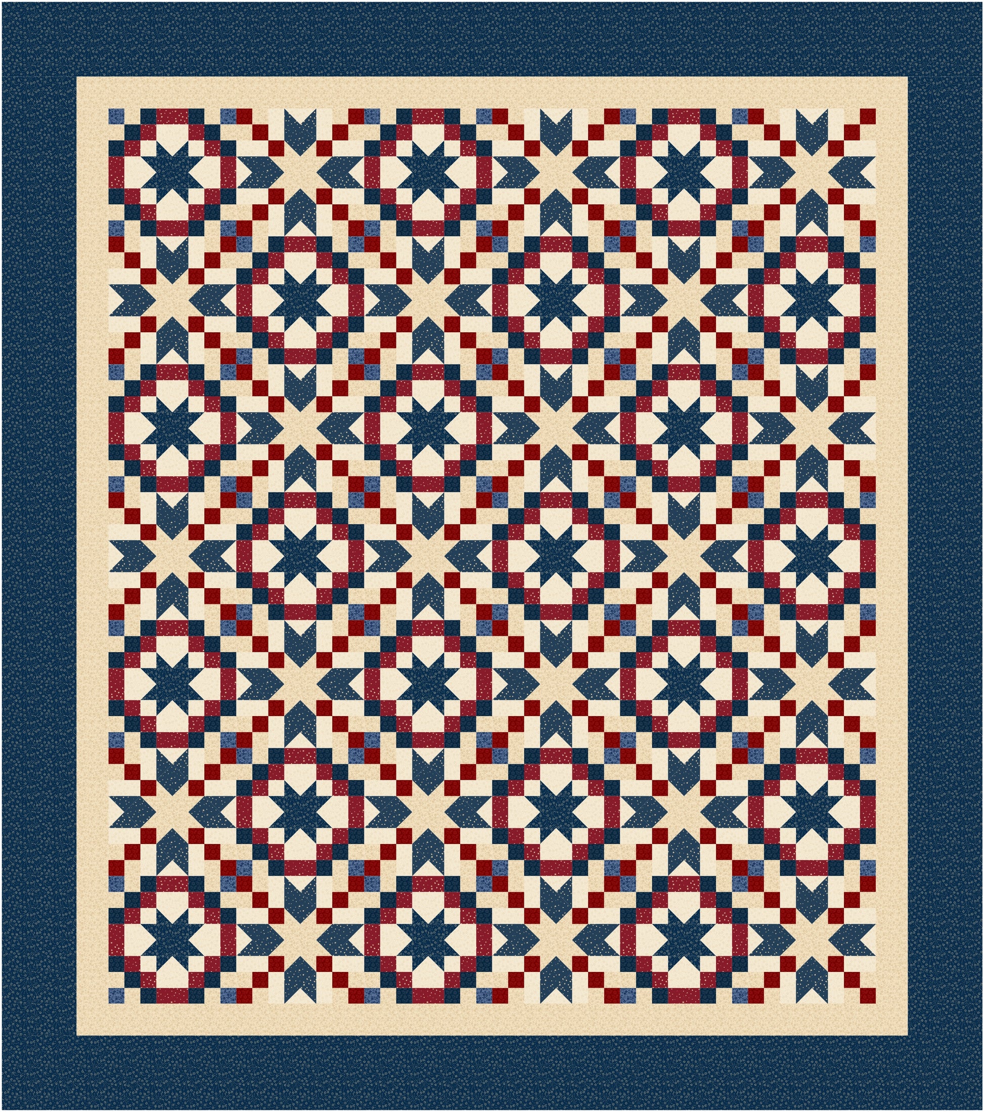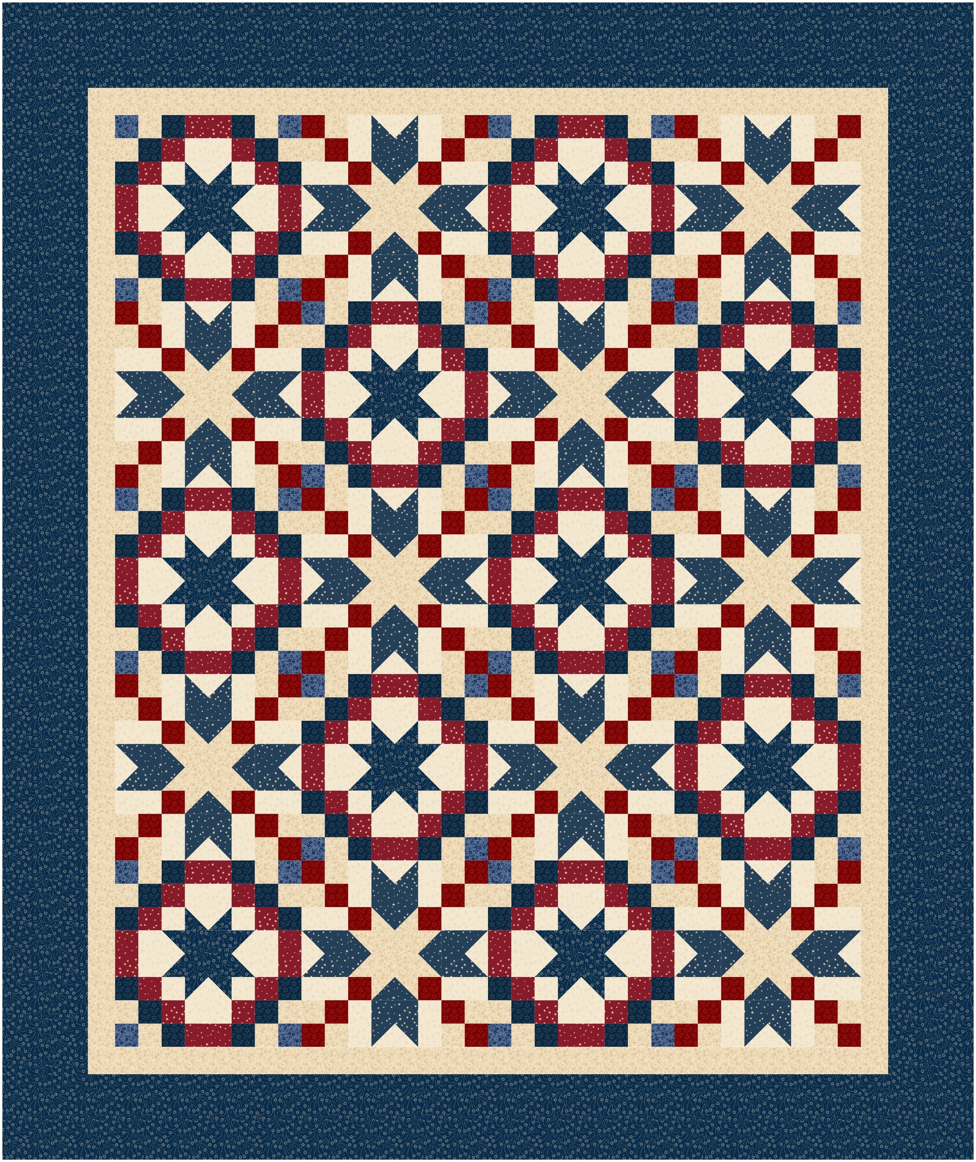 Lady Liberty combines classic stars and elegant chain blocks to create a visually striking quilt that appears intricate but is surprisingly simple to construct. Utilizing modern piecing techniques, this pattern ensures accurate and efficient assembly, making it accessible for confident beginners. The design features generous 12” blocks, allowing you to achieve a bold, sophisticated look with ease.