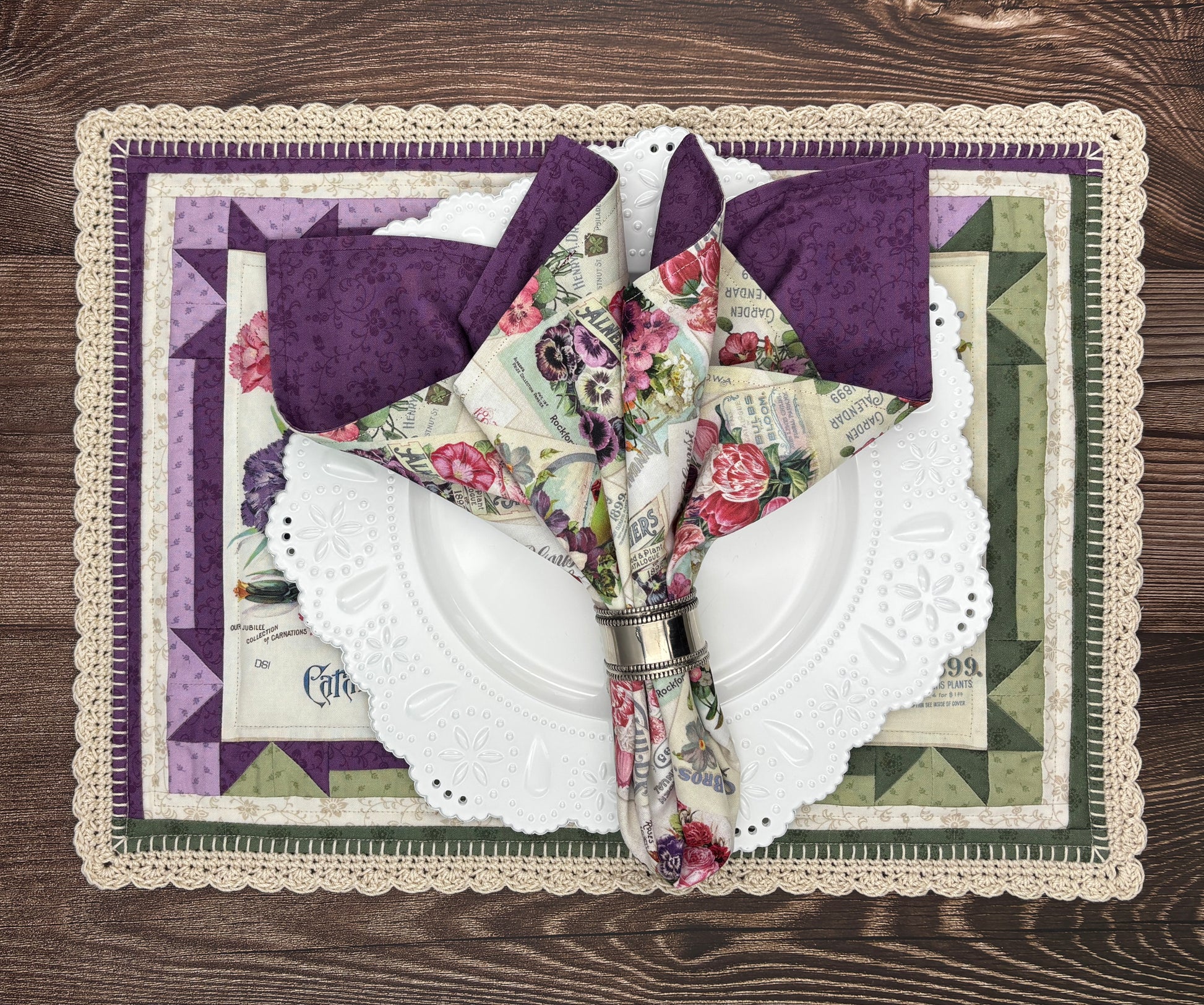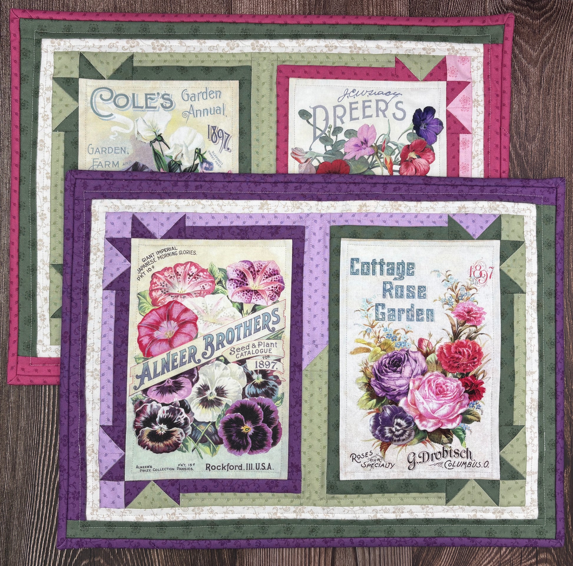 Experience the Victorian elegance of the Vintage Lace Placemat and Napkins set. Lithograph seed catalog covers from the late 1800's are the inspiration behind the Cottage Lace fabric line, as well as the pattern, and have been resurrected from the Smithsonian archives and reprinted as panels. This pattern is perfect for a beginner or advanced quilter and uses the trim down method of piecing to achieve frustration free piecing. The placemats are designed for the fabrics from the Cottage Lace line by Kellie Beckwith for Marcus Fabrics. Placemats finish to 14" x 19" and the double-sided napkins finish to 20" square. Each pattern includes three finishing options for the placemats.